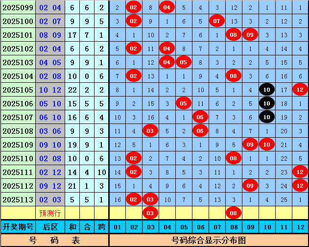 后区号码分析:上期后区开出奖号02 03,和值为5,跨度为1,本期后区参考号码03、06、08、10、12。