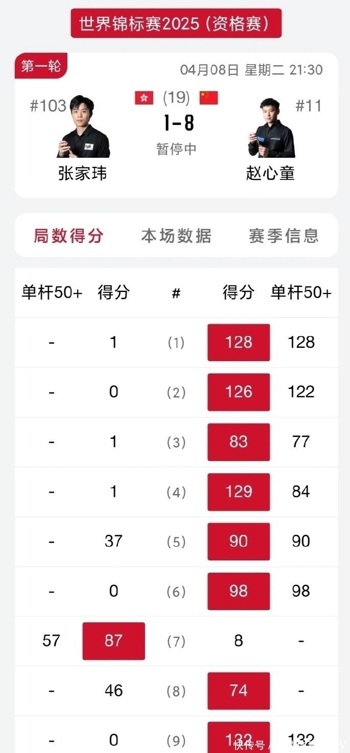 世锦赛经验赛第一轮(144进112轮次),赵心童与中国香港选手张家玮演出中国德比战。这场比赛第一阶段,许久莫得干预矜重劳动比赛的赵心童,以其火爆的伏击手感,赢得8-1的雄伟当先上风。
