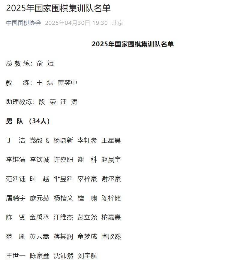 4月30日,中国围棋协会公布2025年国度围棋集训队名单。