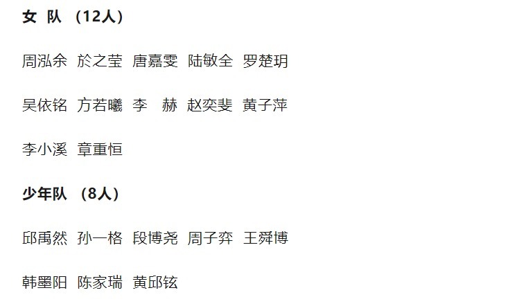 其中俞斌担任总教学,男队丁浩、党毅飞、杨转换、李轩豪等34东说念主入选,女队周泓余、於之莹、唐嘉雯等12东说念主入选,少年队邱禹然、孙一格等8东说念主入选。