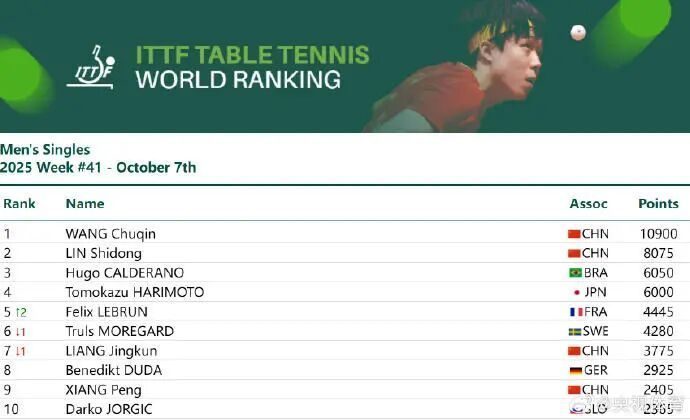 海外乒联公布2025年第41周名次。男片面,王楚钦凭借在WTT中国大满贯中夺冠,宇宙名次积分从9425分跃升至10900分,成为须眉乒坛历史上首位积分破万的通顺员,刷新了海外乒联现行积分纪律下的最高记录。女片面,“万分女王”孙颖莎不息领跑宇宙名次。